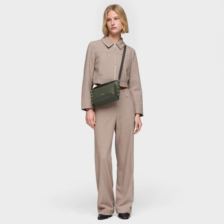 Bolso bandolera de diseño refinado que combina funcionalidad y elegancia. Confeccionado en tonalidad caqui, destaca por sus detalles de studs metálicos que le otorgan un toque sofisticado. Tamaño compacto ideal para llevar lo esencial con estilo. Perfecto para complementar tanto looks casual como más elaborados, este accesorio versátil se adapta a cualquier ocasión. Una pieza imprescindible en tu colección de bolsos.