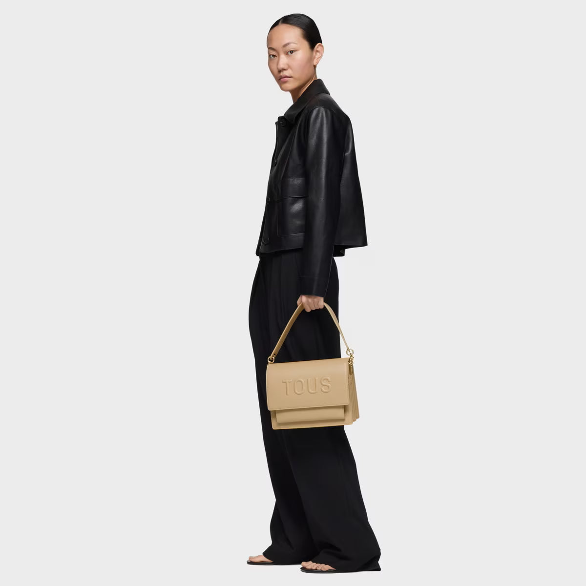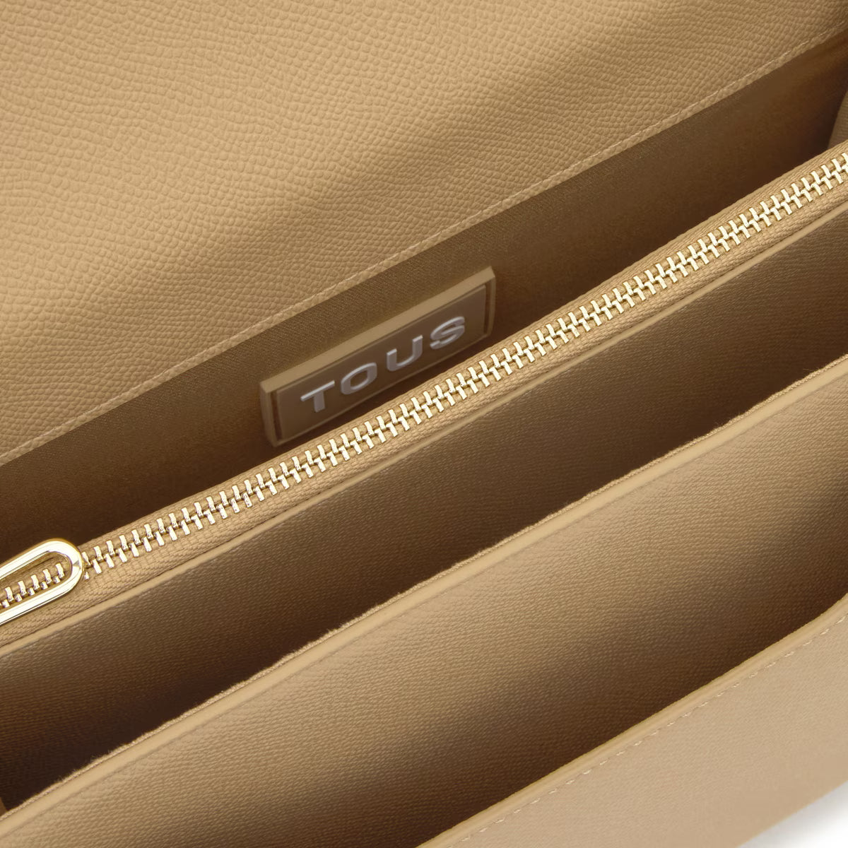 Bolso bandolera mediano Audree TOUS Brenda de poliuretano en color arena. Incorpora una solapa y cierre con dos botones magnéticos. Cuenta con dos compartimentos separados por uno con cremallera y un bolsillo abierto en la parte delantera. Asa de hombro fija y asa bandolera ajustable y desmontable. Medidas (alto x ancho x fondo): 19 x 25 x 11,5 cm