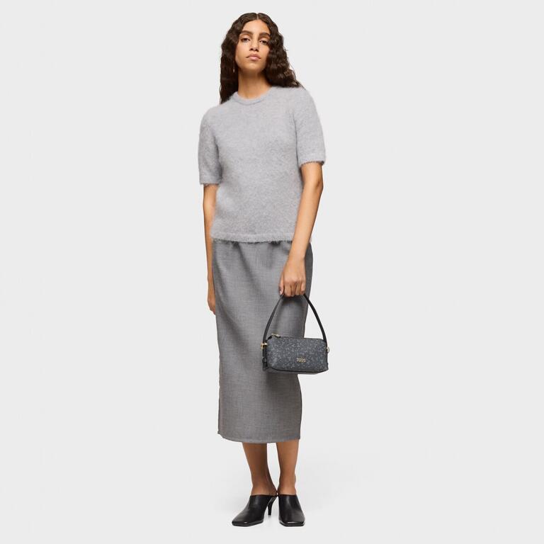 Minibolso Kaos Mini Lines de lona en color gris oscuro. Cierre de cremallera. Asa de hombro ajustable y asa bandolera desmontable.
