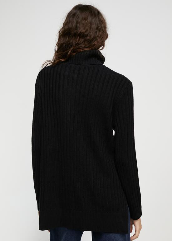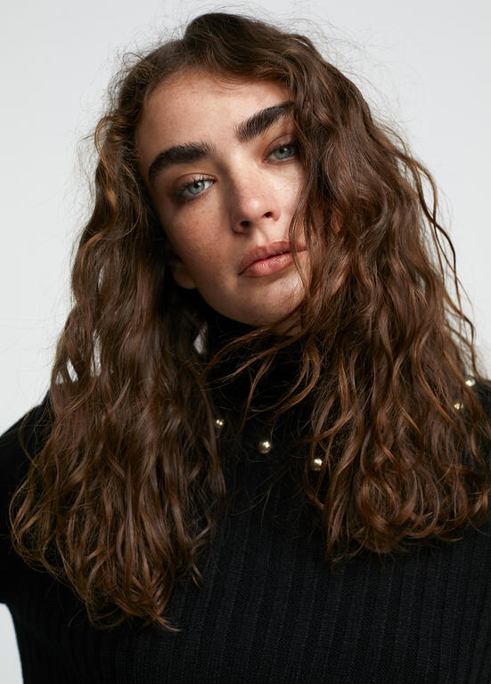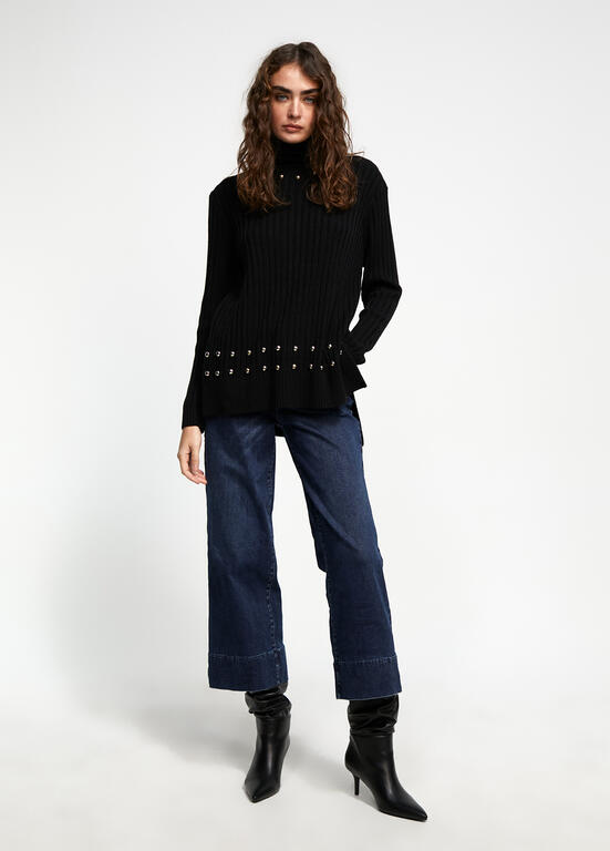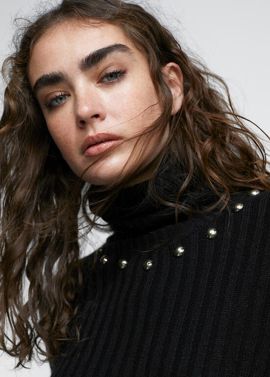 Estupendo jersey con cuello de cisne de la fantástica marca Lola Casademunt con detalles de tachuelas doradas en la parte inferior. Es de la talla M