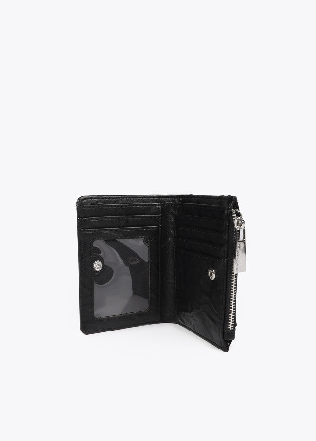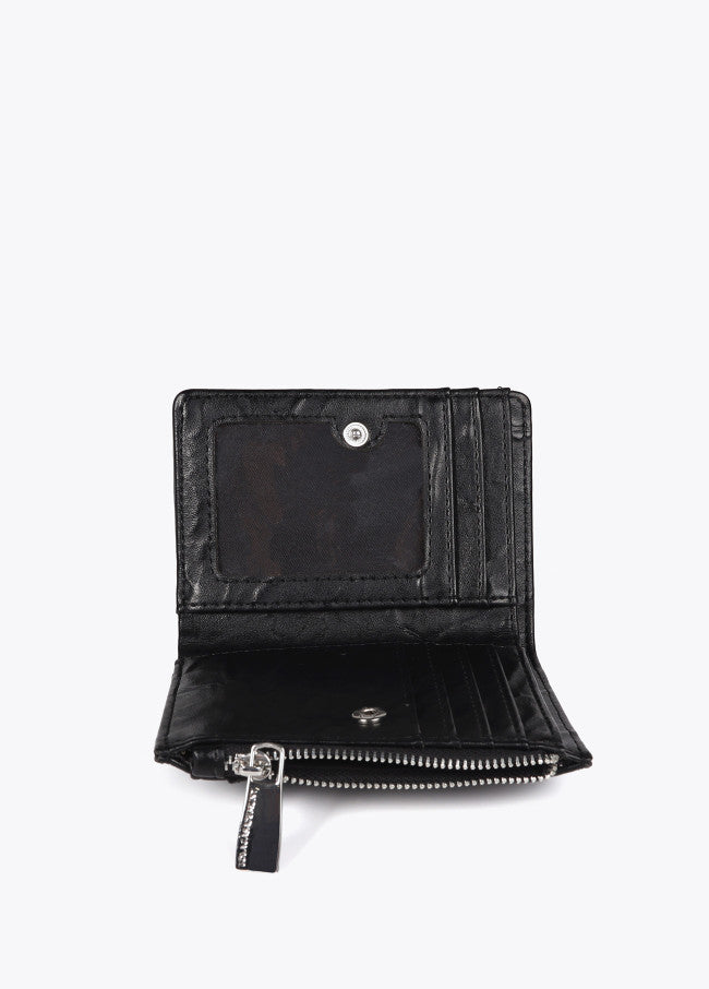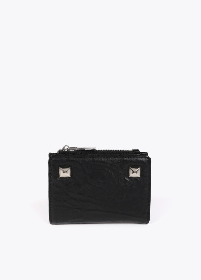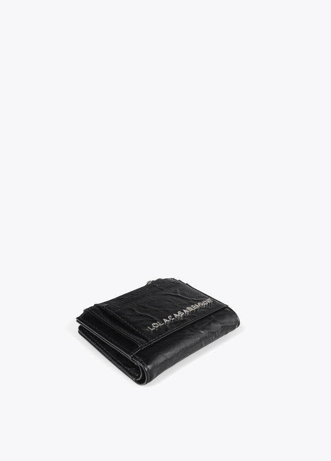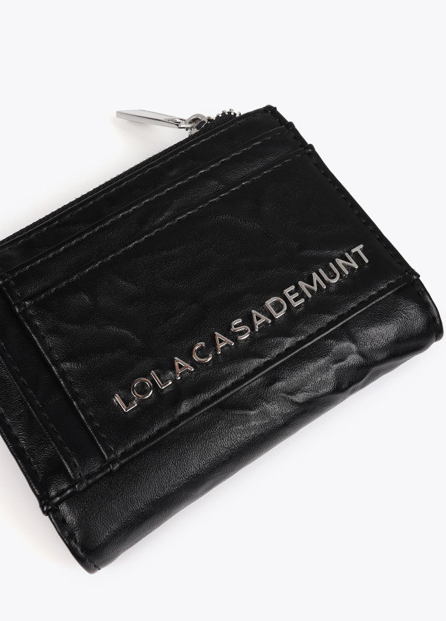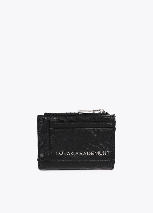 Dale un toque atrevido a tu estilo con este monedero negro de Lola Casademunt. Su efecto piel arrugada y las tachuelas le aportan un aire rebelde y moderno, perfecto para guardar tus esenciales con personalidad. Compacto y con mucho carácter, ¡será tu compañero ideal para destacar en cualquier ocasión!