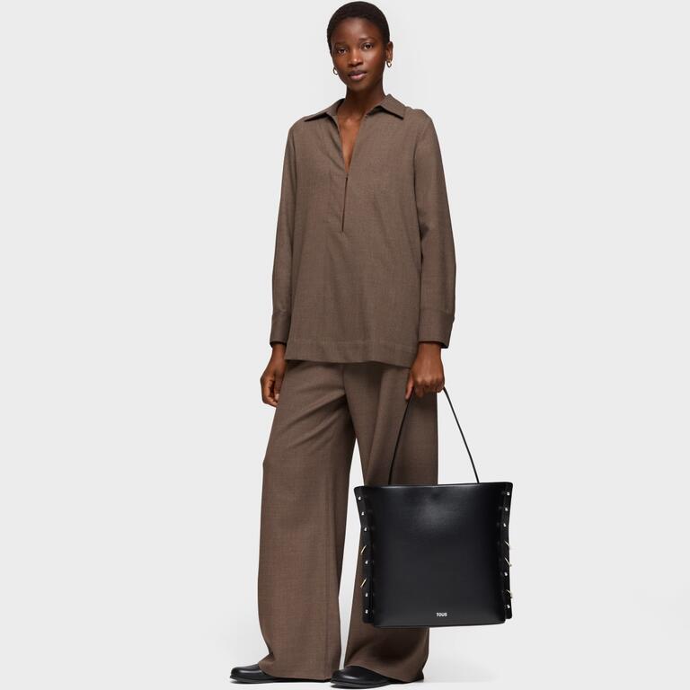 Bolso tote de diseño elegante que combina funcionalidad y estilo. Confeccionado con materiales de calidad, presenta detalles de aretes en negro que añaden un toque sofisticado a tu look cotidiano. Perfecto para llevar tus esenciales con distinción, este accesorio versátil se adapta tanto a outfits casuales como a ocasiones más formales. Un complemento imprescindible para quien busca elegancia sin comprometer la practicidad.